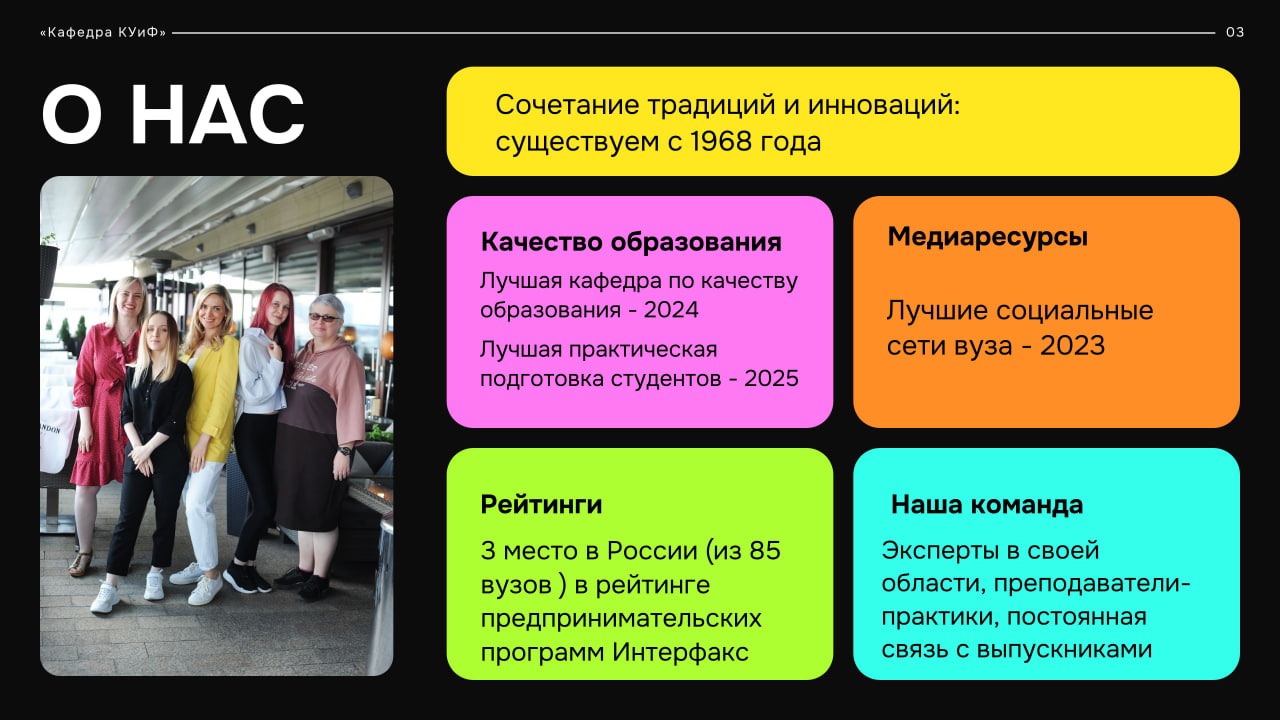 • синтез инноваций и традиций: исторически сложившиеся принципы деятельности (кафедра существует с середины 80-х годов) соединяются с новейшими технологиями обучения.