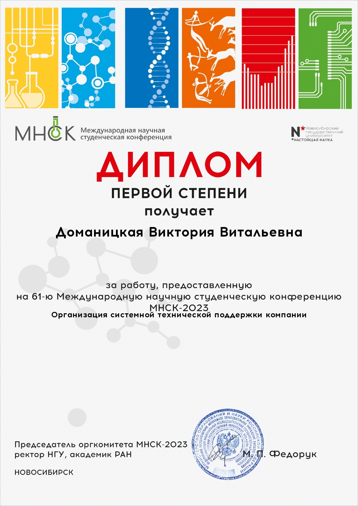 19 апреля на базе НГУЭУ проходила международная научная студенческая конференция, секция "Информационные технологии", где Виктория представила работу "Организация системной технической поддержки компании", написанную под руководством кандидата технических наук, доцента кафедры информационных технологий Гуровой Елены Геннадьевны.