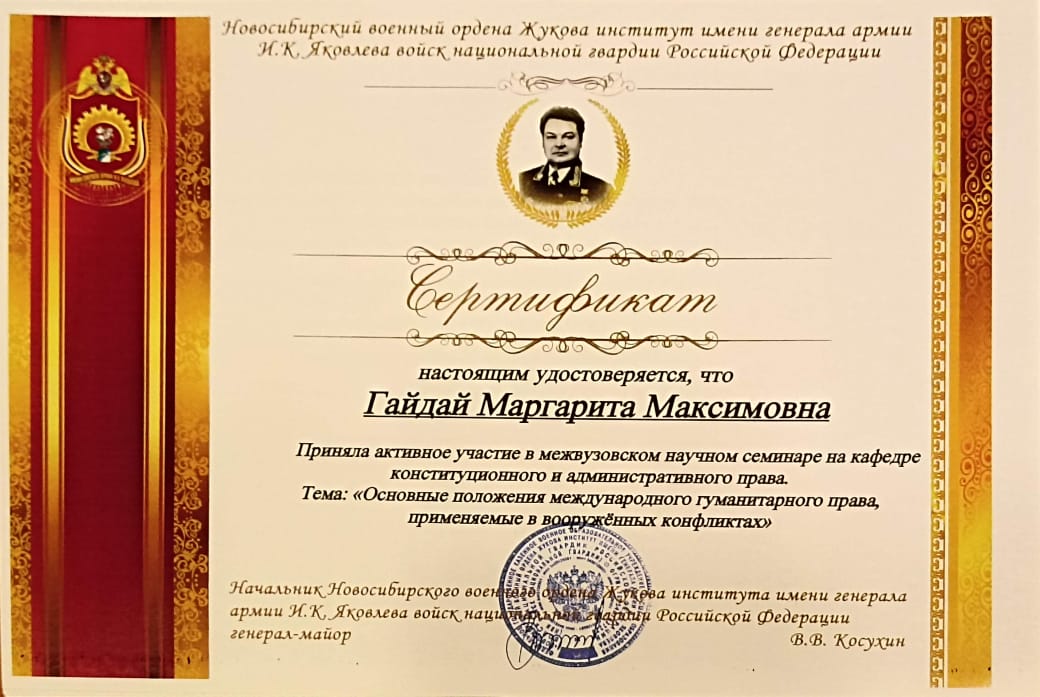 В частности, в рамках Недели науки, наши студенты приняли участие в научном межвузовском семинаре, состоявшегося в Новосибирском военном ордена Жукова институте имени генерала армии И.К. Яковлева войск национальной гвардии Российской Федерации. Вместе с курсантами военного института Анна Агафонова, Владислав Сухомлинов, Маргарита Гайдай обсудили злободневные вопросы соблюдения прав мирного населения на территориях ведения военных действий. Ребята предложили обсудить проблему защиты и охраны объектов культурного наследия в период вооружённых конфликтов, рассказав о критической ситуации в странах: Сирии, Ираке, Йемене, а также с недавнего времени и на Украине. Участникам были вручены сертификаты.