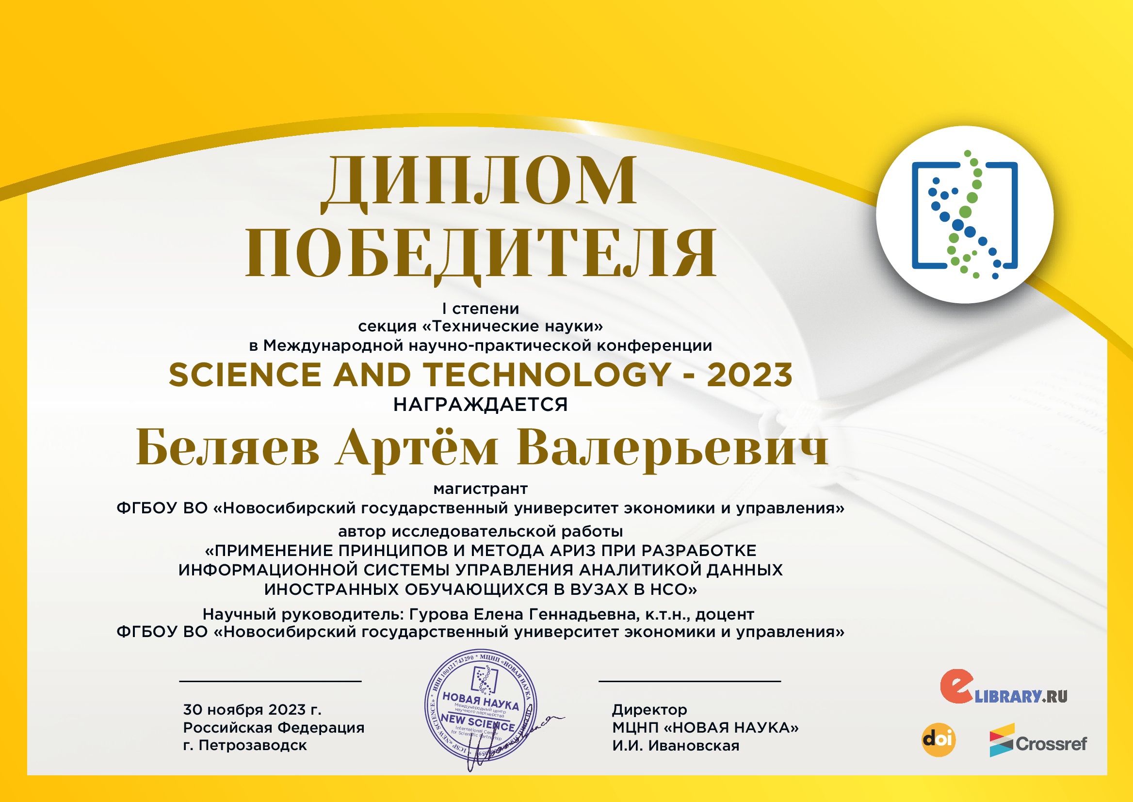 Артём Валерьевич представил исследовательскую работу на тему: "ПРИМЕНЕНИЕ ПРИНЦИПОВ И МЕТОДА АРИЗ ПРИ РАЗРАБОТКЕ ИНФОРМАЦИОННОЙ СИСТЕМЫ УПРАВЛЕНИЯ АНАЛИТИКОЙ ДАННЫХ ИНОСТРАННЫХ ОБУЧАЮЩИХСЯ В ВУЗАХ В НСО". Научный руководитель Елена Геннадьевна Гурова, кандидат технических наук, доцент кафедры информационных технологий. Поздравляем с победой!