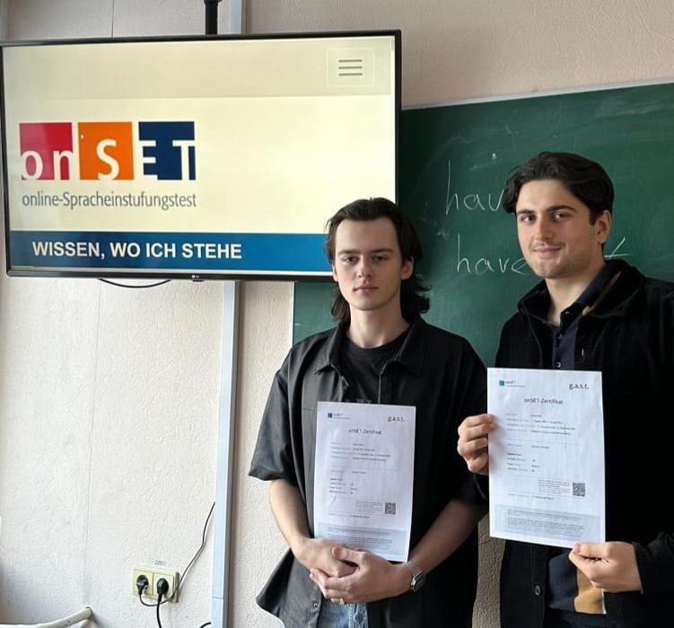 Даниель Халиль и Максим Денисов (гр. МОТ101, преподаватель - канд. пед. наук, доцент КИЯ НГУЭУ Н.И. Нос) сдали международный экзамен Onset, подтвердив владение немецким языком на уровне В2!