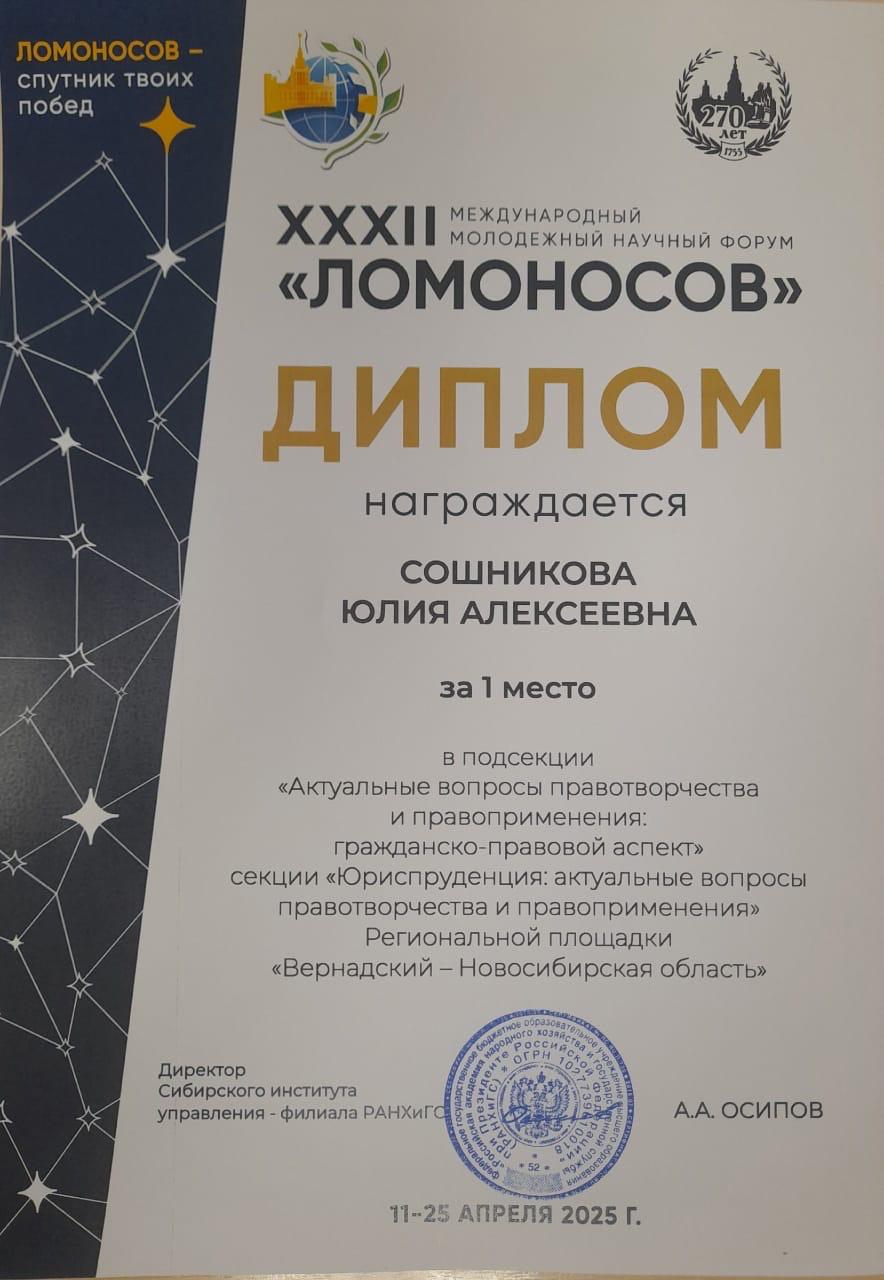 Студенты Юридического факультета Новосибирского государственного университета успешно выступили на секции «Юриспруденция: актуальные вопросы правотворчества и правоприменения» Международной научной конференции «Ломоносов 2025».