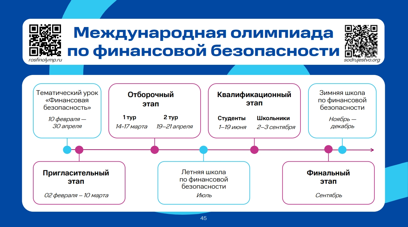 Олимпиада проводится на платформе «Содружество»: для студентов образовательных организаций высшего образования по направлениям подготовки «Юриспруденция», «Информационная безопасность», «Экономика», «Международные отношения»; для учащихся 8-10 классов общеобразовательных организаций – по теме «Финансовая безопасность» с учетом содержания учебных предметов «Математика», Информатика» и «Обществознание».