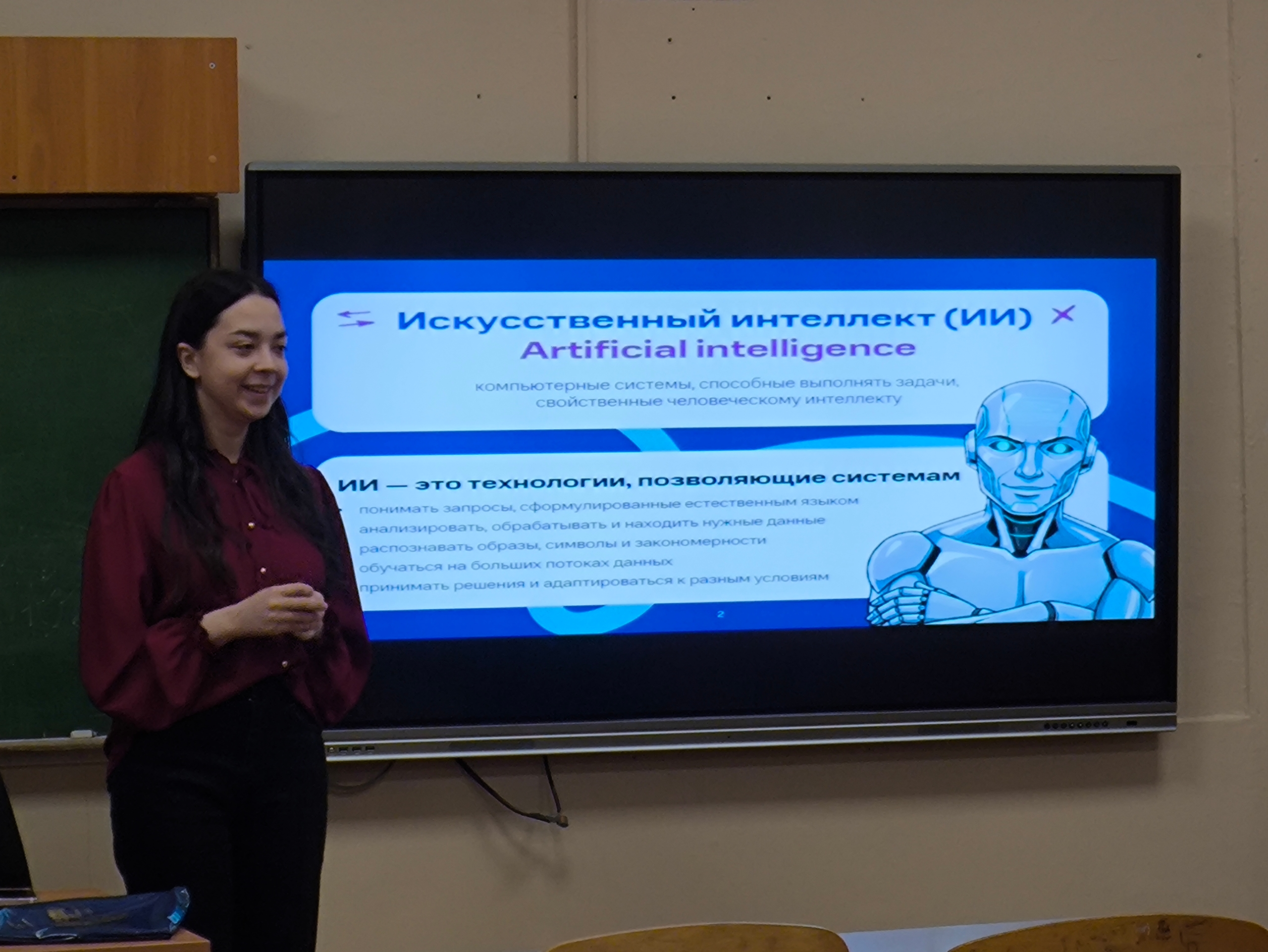 В рамках Урока студенты НГУЭУ специальности Экономическая безопасность Валерия Протас, Полина Новикова и Анастасия Глухарева не только рассказали об угрозах, которые таит в себе искусственный интеллект, но и поделились своим опытом участия в финальных неделях Олимпиады.
